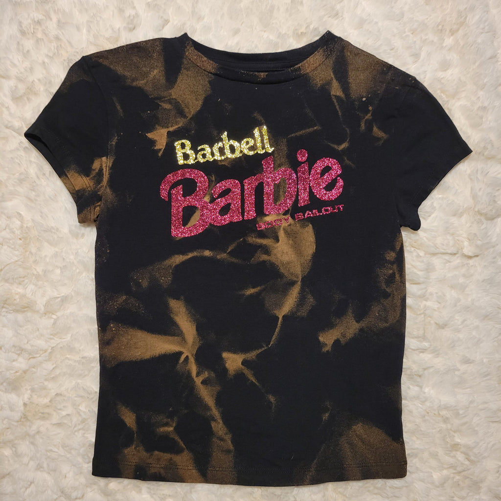 Bleached black, crew neck, fitted t-shirt with "Barbell Barbie" design in gold and rose-pink glitter.