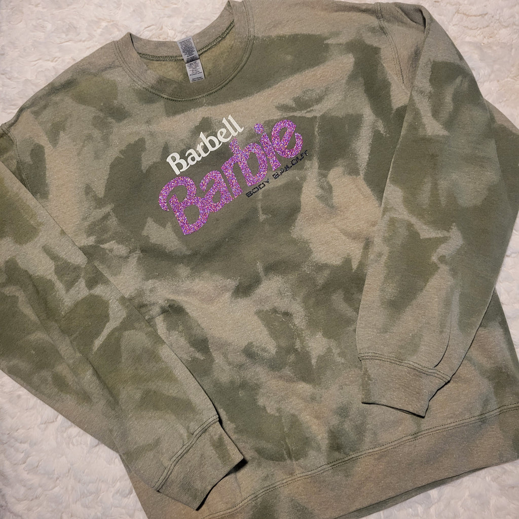 Bleached olive green crewneck sweatshirt with "Barbell Barbie" design in white and purple glitter.