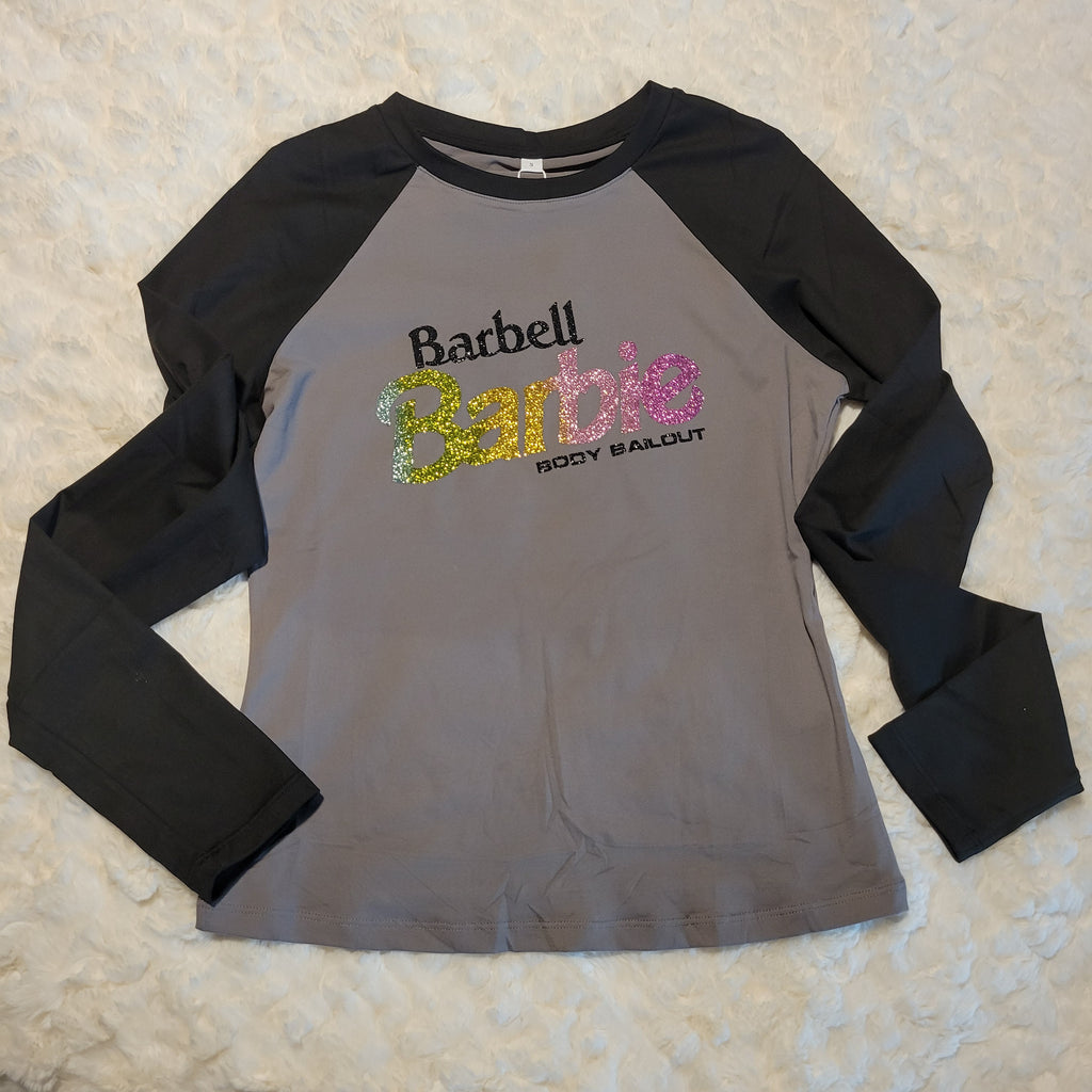 Gray & black baseball t-shirt with "Barbell Barbie" design in rainbow and black glitter. Full length sleeves.