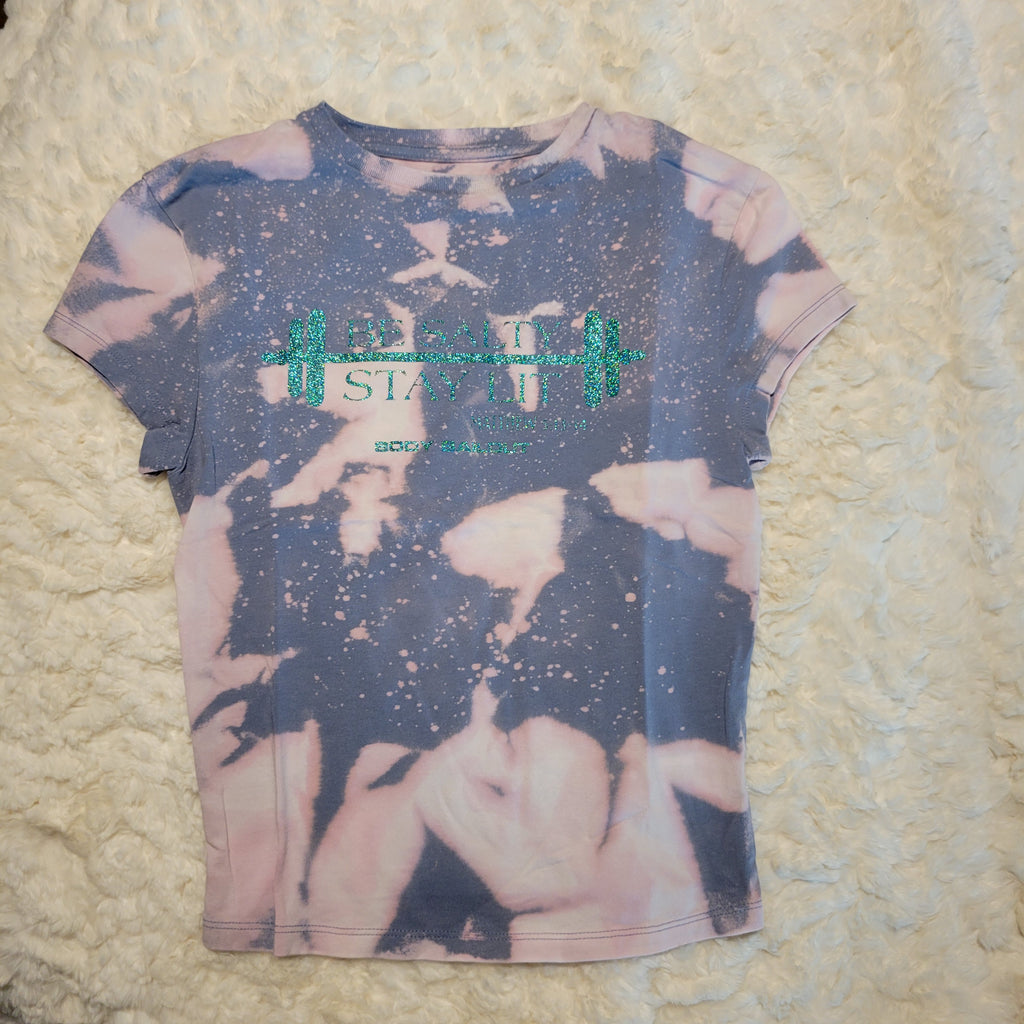 Bleached denim blue, crew neck, fitted t-shirt with "Be Salty Stay Lit" design in aqua blue glitter.