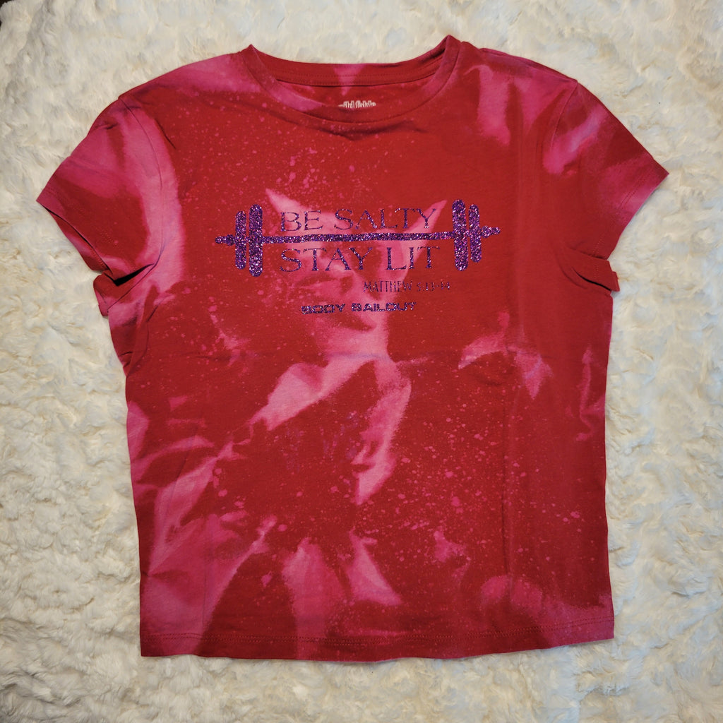Bleached red, crew neck, fitted t-shirt with "Be Salty Stay Lit" design in purple glitter.