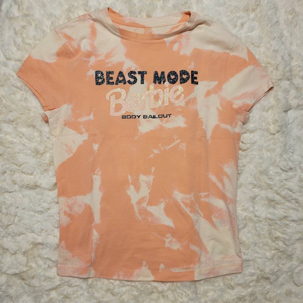 Bleached apricot, crew neck, fitted t-shirt with "Beast Mode Barbie" design in black and pale peach glitter.