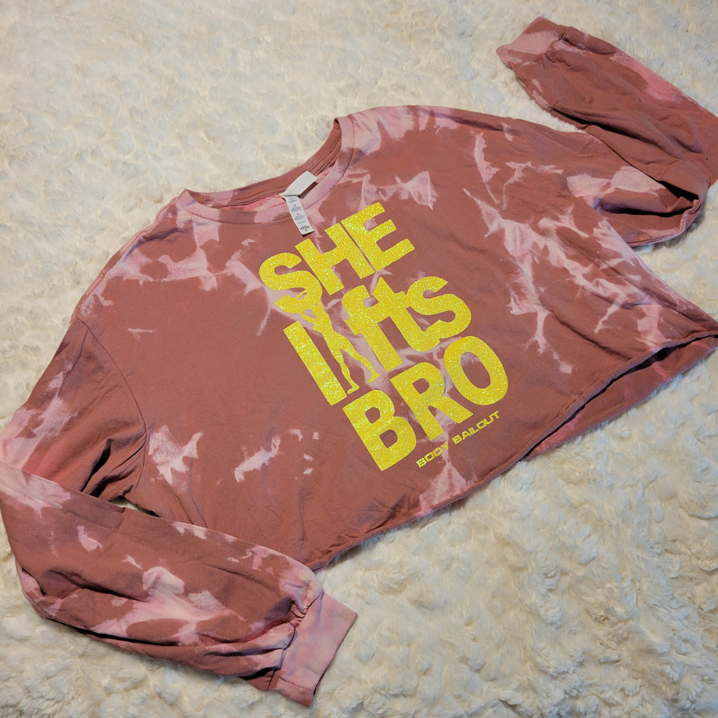 Bleached desert pink long-sleeved ladies' t-shirt with "She Lifts Bro" design yellow glitter.
