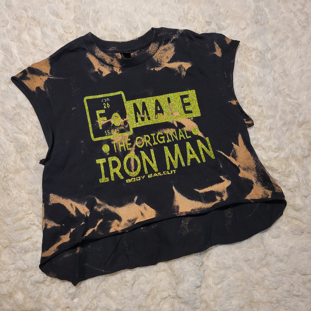 Bleached black crewneck t-shirt with "FeMALE the Original Iron Man" design in lime green/gold glitter. Cropped length. Raw hem on bottom and sleeves.