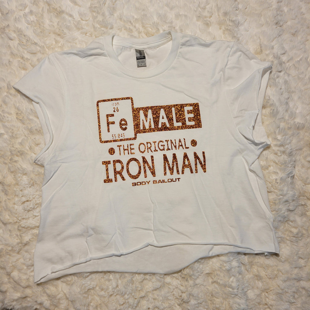 White crewneck t-shirt with "FeMALE the Original Iron Man" design in rusty orange glitter. Cropped length. Raw hem on bottom and sleeves.