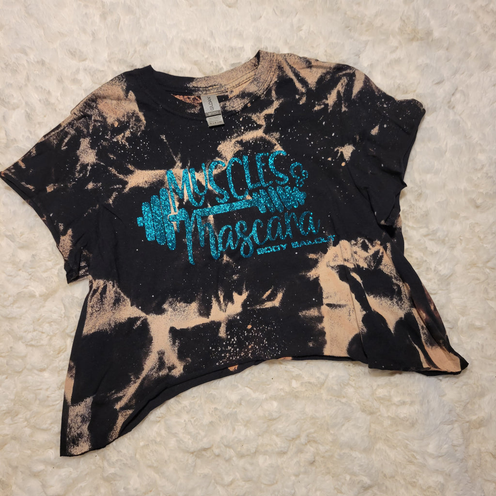 Bleached black crewneck t-shirt with "Muscles & Mascara" design in turquoise glitter. Cropped length. Raw hem on bottom and sleeves.
