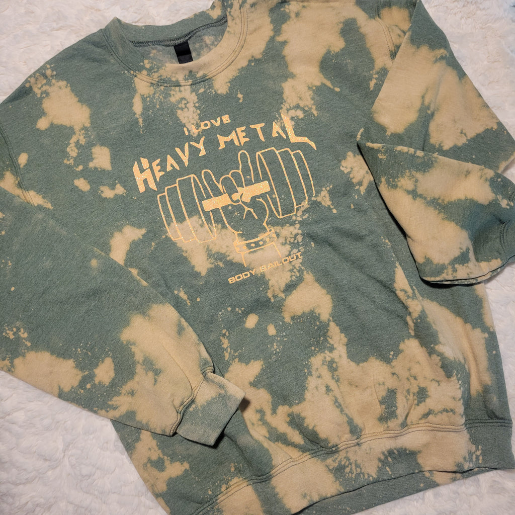 Bleached military green crewneck sweatshirt with "I Love Heavy Metal" design in peach glitter.