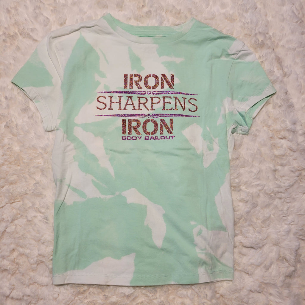 Bleached seafoam green, crew neck, fitted t-shirt with "Iron Sharpens Iron" design in rose-gold and purple glitter.