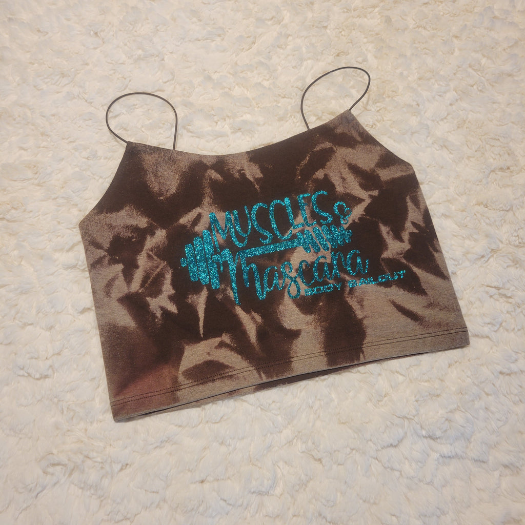 Bleached brown, slim-fit cami tank in a cropped length. Spaghetti straps. Fully lined. "Muscles & Mascara" design in teal glitter.