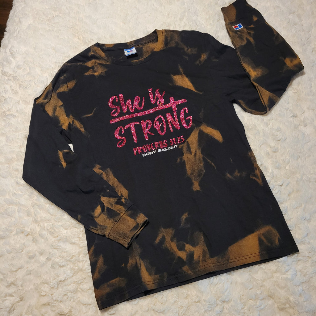 Bleached black, long-sleeved t-shirt with "She Is Strong" design in dark pink and white glitter.