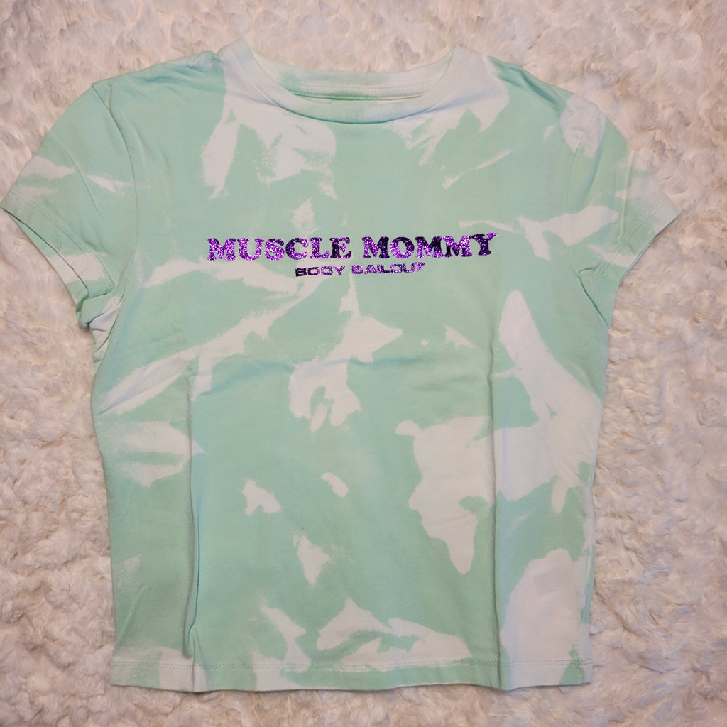 Bleached seafoam green, crew neck, fitted t-shirt with "Muscle Mommy" design in purple glitter.