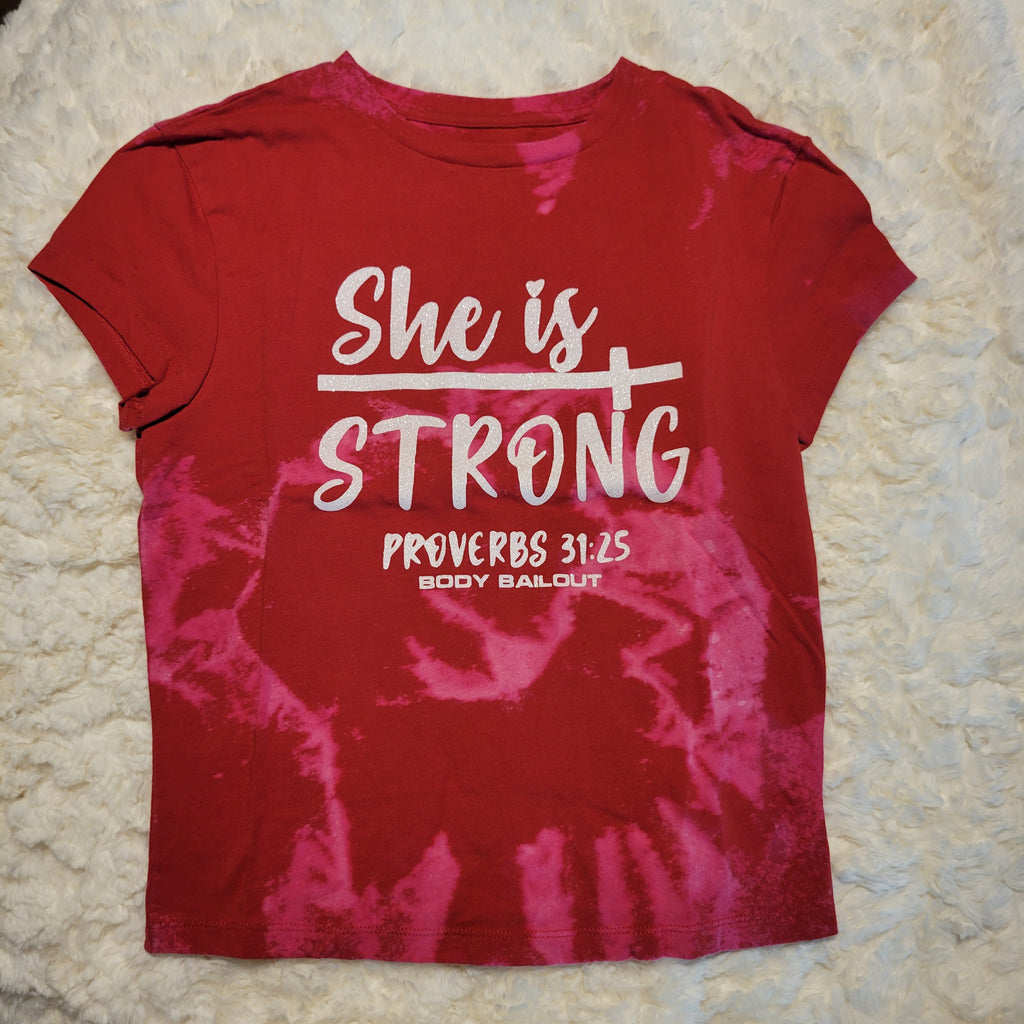 Bleached red, crew neck, fitted t-shirt with "She Is Strong" design in white glitter.